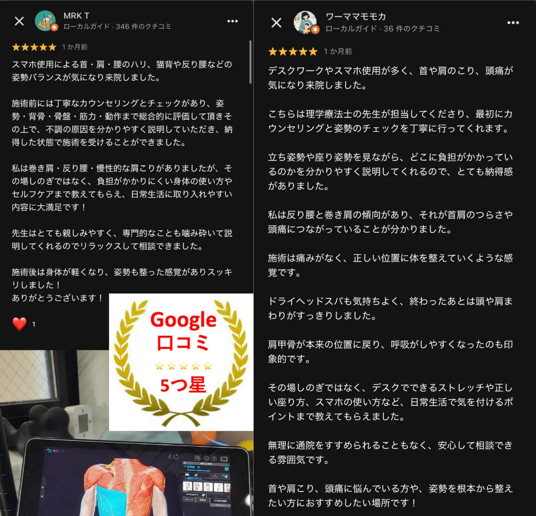 私は巻き肩・反り腰・慢性的な肩こりがありましたが、その場しのぎではなく、負担がかかりにくい身体の使い方やセルフケアまで教えてもらえ、日常生活に取り入れやすい内容に大満足です!