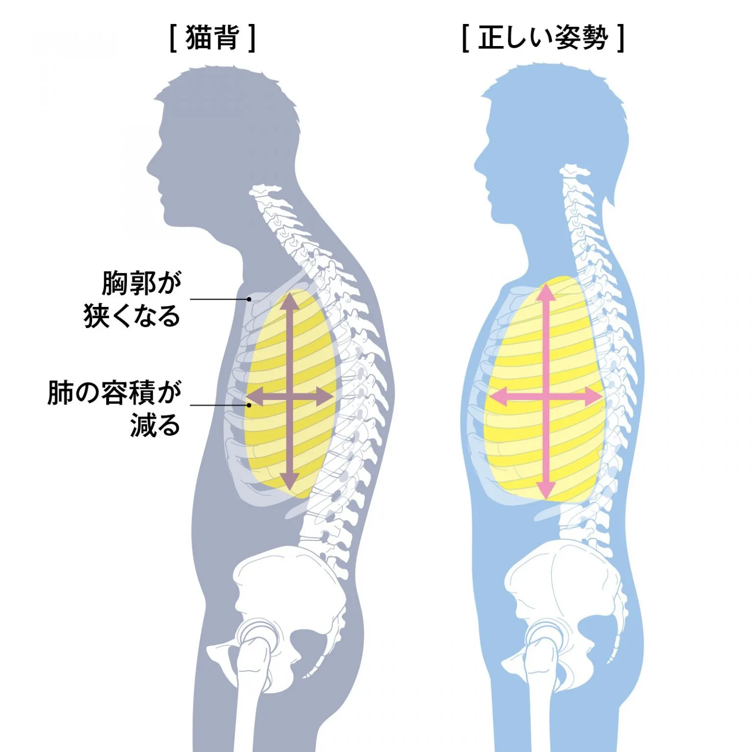 首(頚椎)や胸郭の動きは、呼吸の深さやしやすさに大きく影響します。猫背やストレートネックなどの不良姿勢により、胸郭や肋骨、横隔膜の可動域が狭くなると、深い呼吸が困難になり、息苦しさを感じやすくなります。